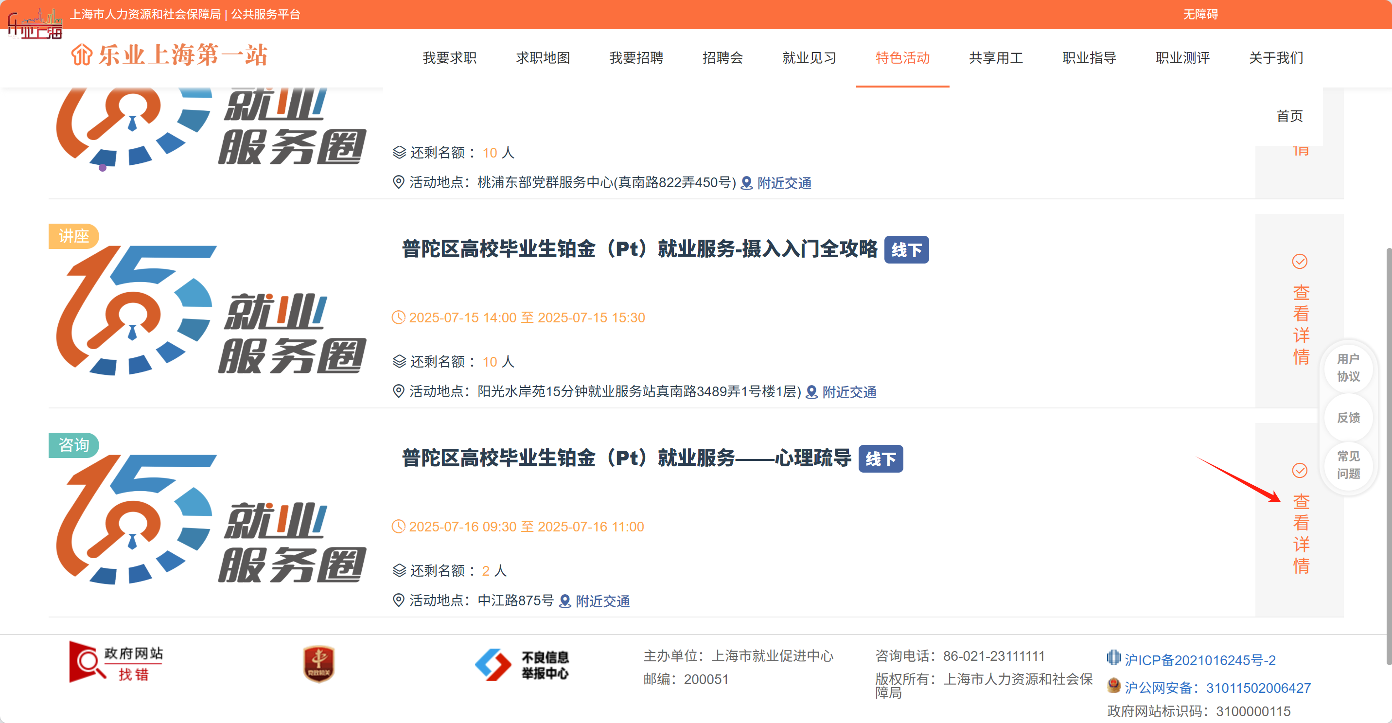 1. 打开网页“乐业上海第一站”并完成登录,点击“特色活动”进入界面。