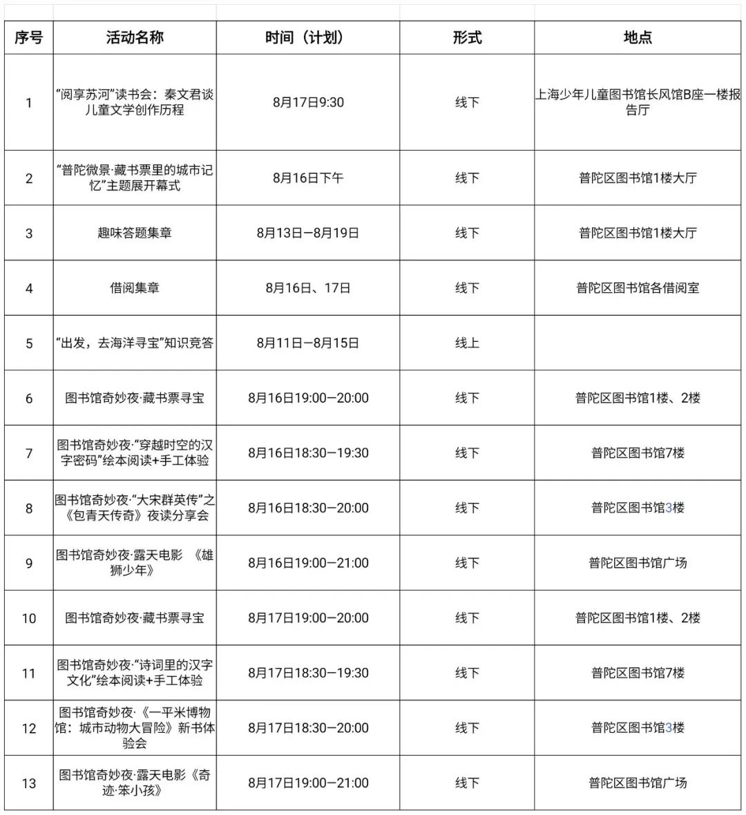 普陀区10个街道镇图书馆将组织阅读爱好者、文化志愿者开展一系列丰富多彩的文化活动。从绘本故事演绎、传统文化讲座到读书分享会、旗袍手作,再到阅读马拉松等,各种活动应有尽有,满足不同年龄层、不同兴趣爱好的市民需求。同时,各街镇图书馆还将推出主题书单推介、视频讲座等线上活动资源,让市民在家门口就能享受到丰富的文化大餐。