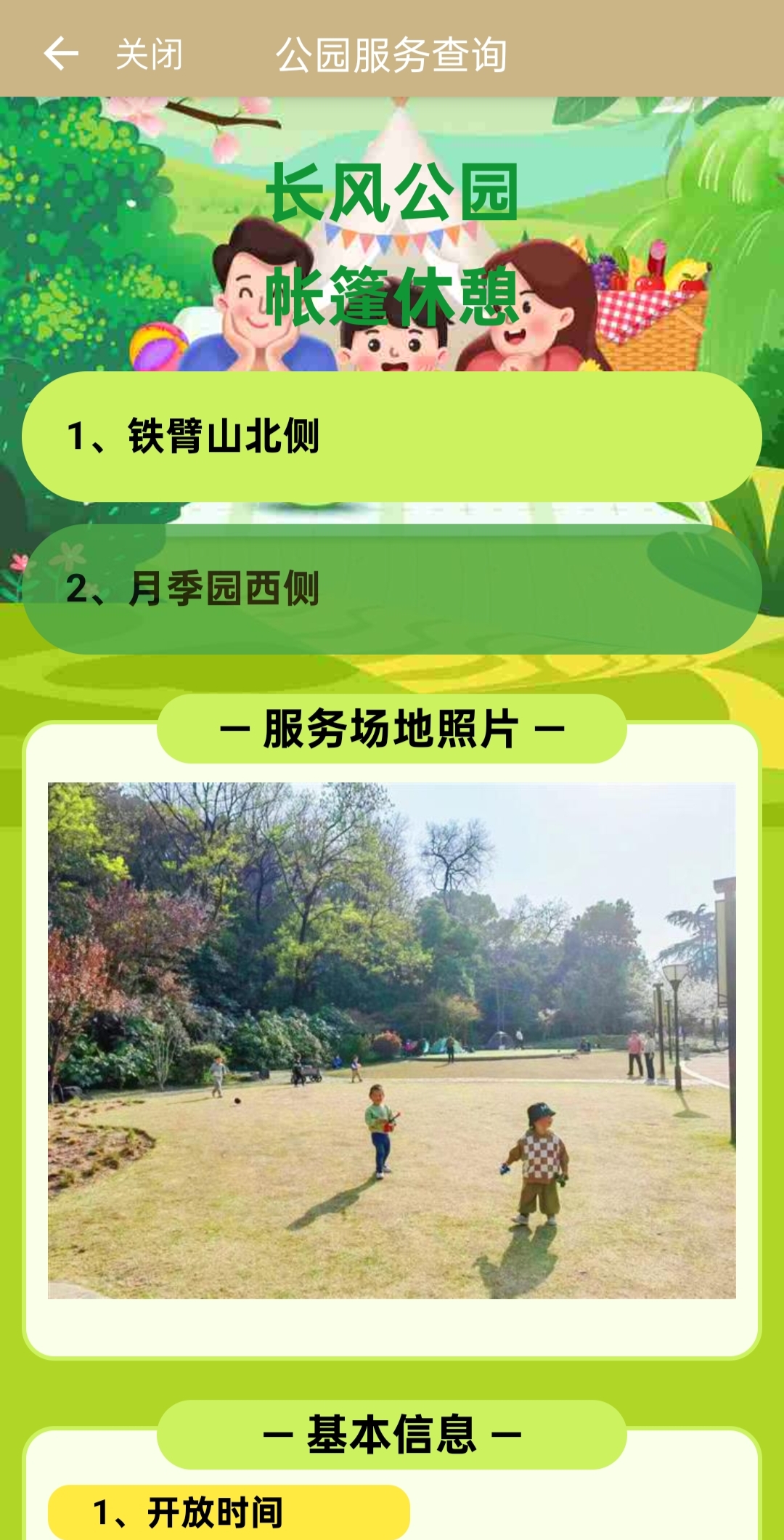在“公园查询服务”专区,映入眼帘的四个分类:“宠物友好”“帐篷休憩”“风筝踏青”“体育健身”,市民们可以根据自身需求选择相应的分类进行筛选。