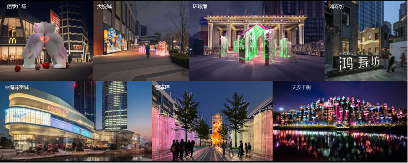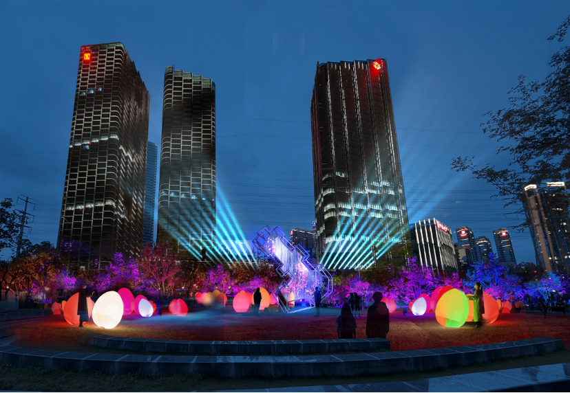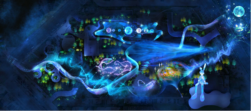 以行进式游览方式,将海纳公园打造成为沉浸式光影展示区。结合“一步一光景,一影一城事”的设计理念,通过光影艺术装置与沉浸式互动体验等形式,打造一条可触摸的城市记忆、当下时尚、科创未来的数字长廊。展现普陀区的地标记忆、红色文化、市井烟火与生态文脉。