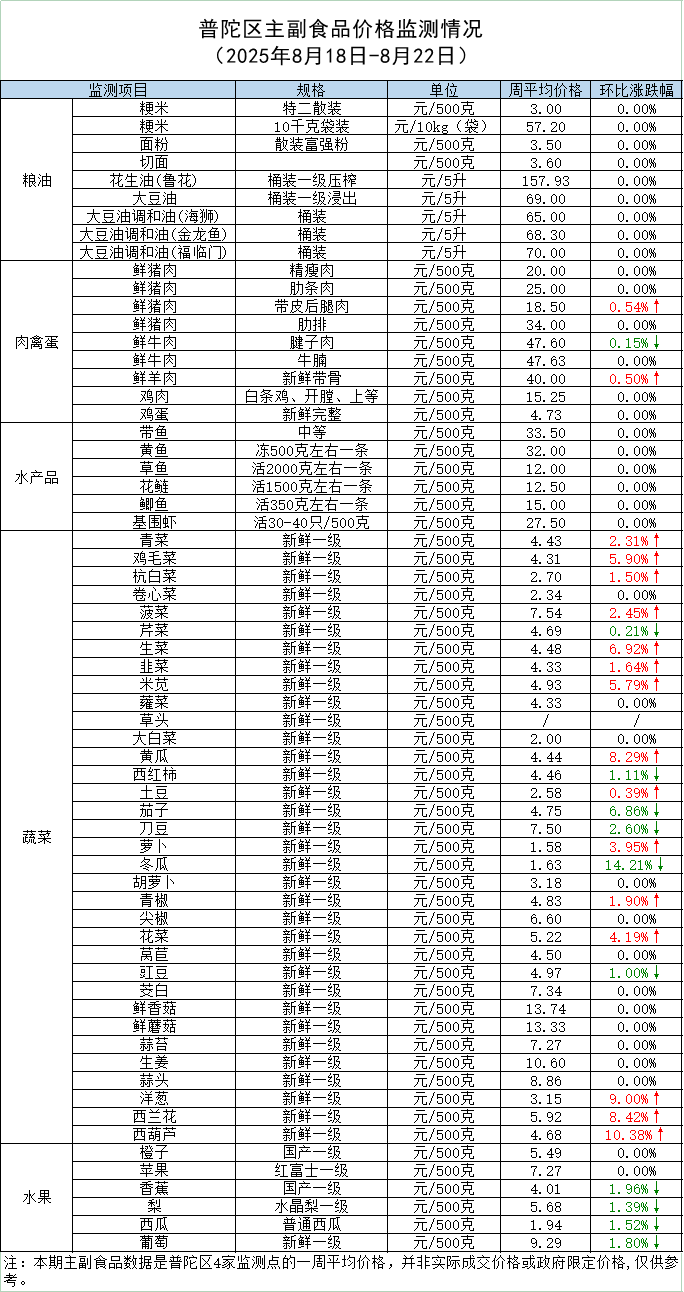 普陀区主副食品价格监测情况 (2025年8月22日)