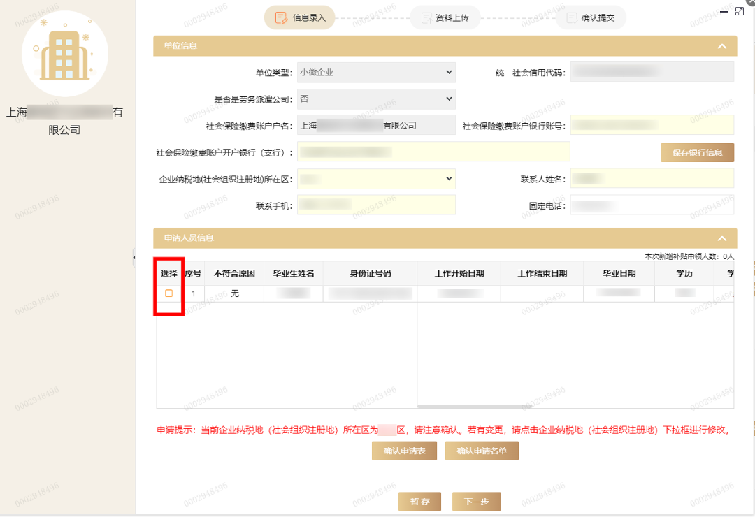 2、确认单位相关信息,填写经办人姓名、联系手机等信息后(也可维护企业纳税地所在区、补贴发放银行账号信息),在“申请人员信息”中勾选申请补贴人员。