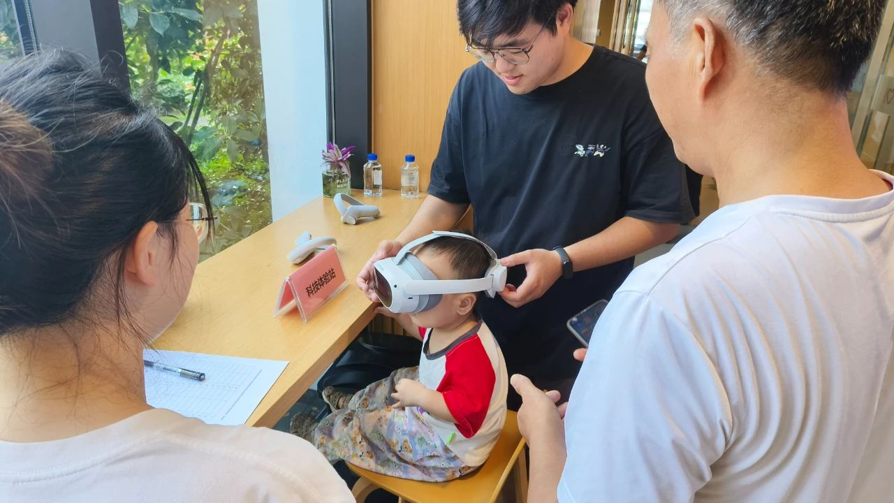 来自长风湾社区书院的“长风科普e栈”展位以长风新村苏州河生态为叙事主线,VR眼镜玩转虚拟互动、无人机模型瞰长风湾宏观,打造全维度科学探索体验。通过“显微观测—虚拟交互—无人机俯瞰”三种体验,构建“微观→宏观→虚拟”的全维度科学探索场景。