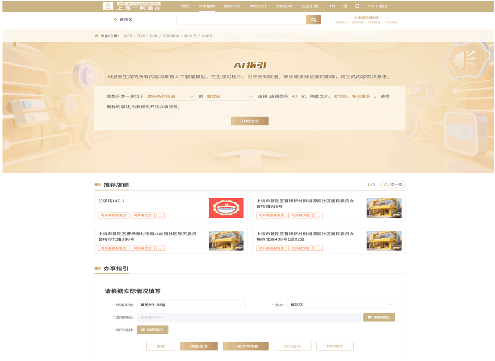 登录上海市 “一网通办” 官网,选择普陀区进入“开店一件事全生命周期服务专区”,根据店铺类型(沿街商铺/商业综合体)一键进入办理页面。这里不仅有可视化地图选址、智能流程模拟,更能生成专属办事指南,材料预审、表单助填等功能全程护航,让您轻点屏幕,就能解锁开店全流程。