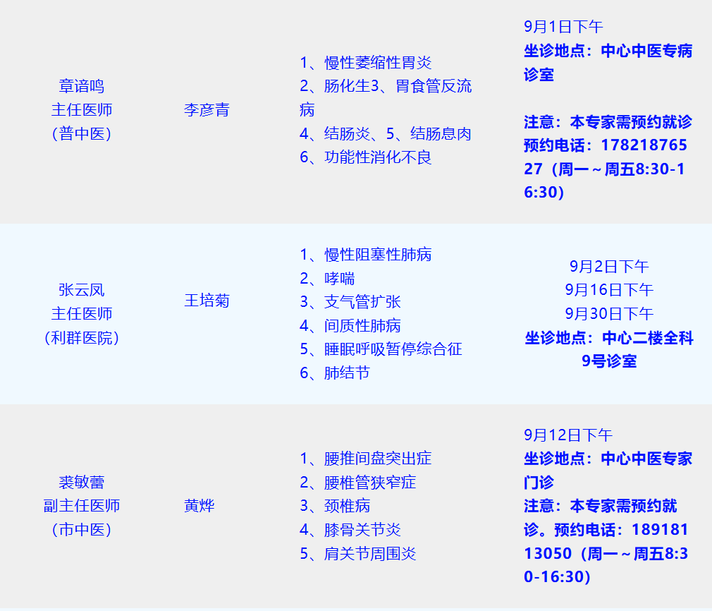 另:陈敬贤副主任每周二上午东新站点吴政医生处预约;失眠门诊每周二下午东新站点1楼名中医工作室预约,避免跑空!