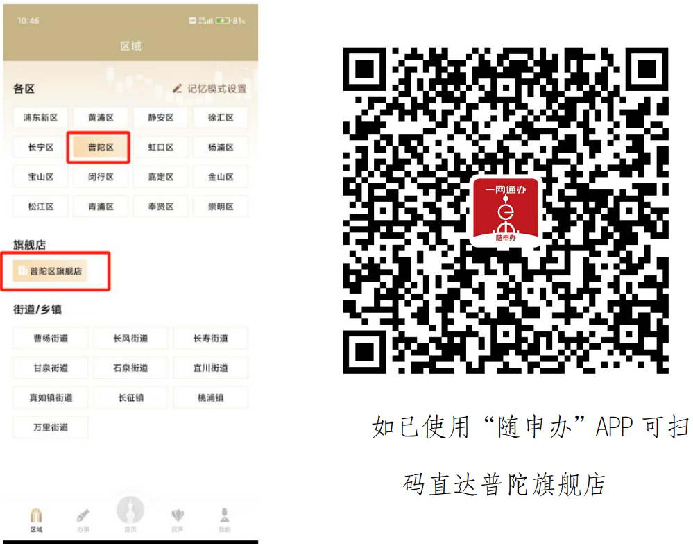 第一步:新用户请下载“随申办”市民云App,完成实名后,选择下方“区域”频道或者直接精准定位点击进入普陀旗舰店主页。