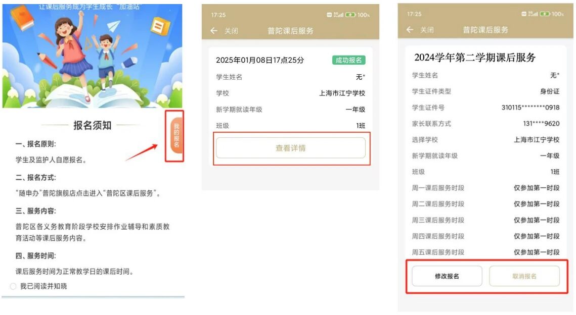 第五步:如果家长需要修改或者取消报名信息的,可在报名界面点击我的报名,然后点击查看详情,然后在页面底部,就可以看到修改或者取消报名的按键,进行修改/取消等操作。