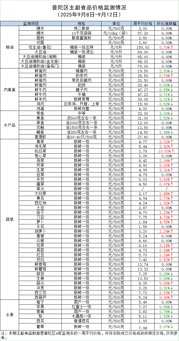 普陀区主副食品价格监测情况 (2025年9月12日)