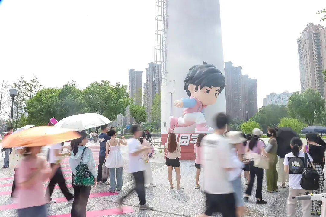 无论游客是乘船而来,还是搭乘公交巡游,都会在半马苏河公园遇见“周同学”。这里设立的“寻找周同学”粉红运动场,以其鲜明色调和丰富活动,成为今秋最受瞩目的潮流聚集地。现场一座高达三米的“周同学”巨型卡通雕塑屹立于公园标志性的白色大烟囱旁,周边环绕着各类粉色主题运动装置与互动打卡点,营造出梦幻而又动感的氛围。