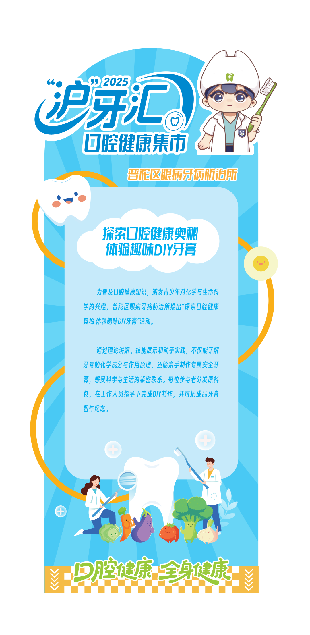 活动现场,上海首个口腔健康专属吉祥物“沪牙宝”将正式发布。“沪”字谐音为“护”,“沪牙宝”设计融入口腔健康理念与上海城市特色,将成为上海口腔健康科普的新载体。首届“沪牙汇”游园集市也将与市民见面。集市上,全市16个区的口腔病防治机构搭建展位,各区将结合自身优势,自主设计形式多样、内容丰富的口腔科普活动,无论是趣味互动体验、口腔知识讲解,还是护牙技巧演示,都能让市民在轻松氛围中学习口腔健康知识,提升护牙意识。