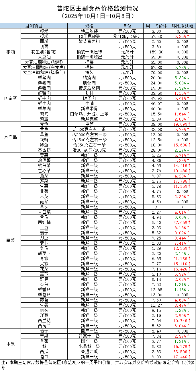 普陀区主副食品价格监测情况 (2025年10月9日)
