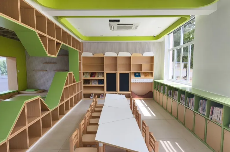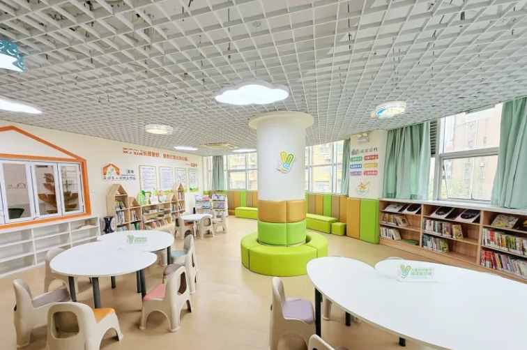 长寿路街道儿童友好城市阅读新空间以“自然、温暖、启智、安全”为设计理念,打造集阅读、游戏、社交、探索于一体的综合性儿童活动天地。空间采用原木色地板搭配绿色、黄色等柔和色彩,顶部以星空、云朵造型灯饰点缀,大面积窗户引入自然光,整体氛围明亮温馨,充满童真与活力。