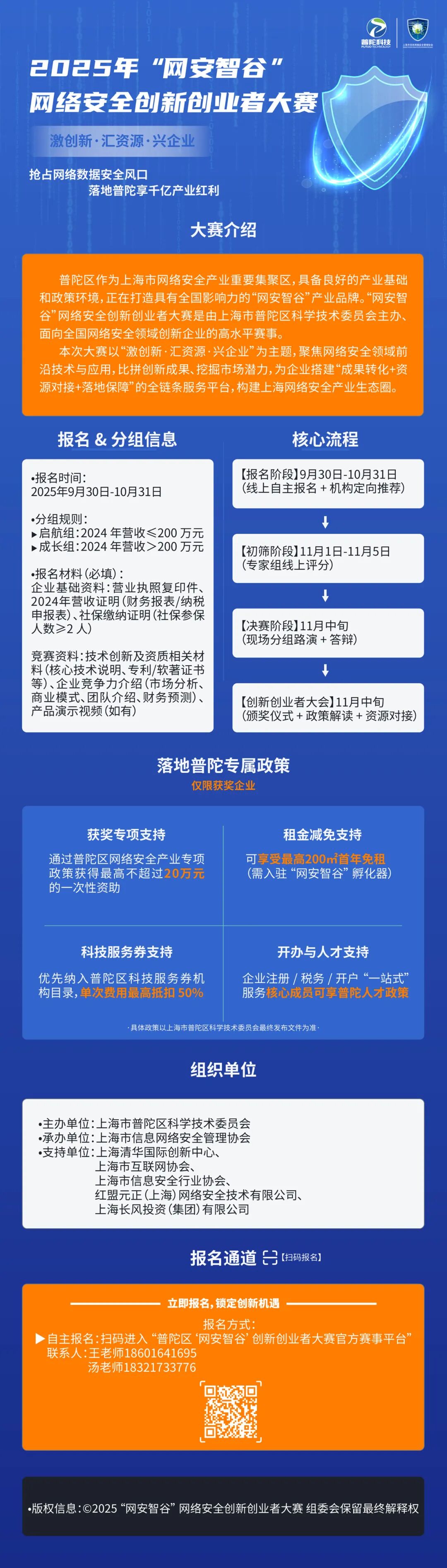 不管你是掌握核心技术的初创型企业,还是求突破的成长型企业,只要揣着网络安全创新创业梦,想在行业浪潮中崭露头角,诚邀您即刻报名参赛!让我们一起“谱写梦想、托举未来”,共赴产业盛宴、抢占发展先机,在普陀沃土上实现企业腾飞!