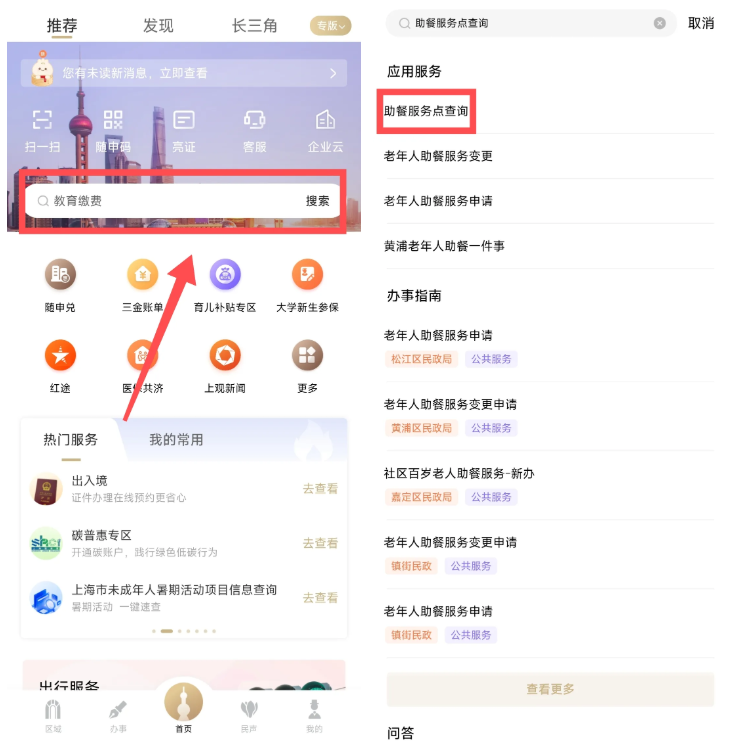 1、打开“随申办市民云”(APP/微信小程序/支付宝小程序),在首页通过关键词搜索“助餐服务点查询”,点击对应选项即可进入服务。