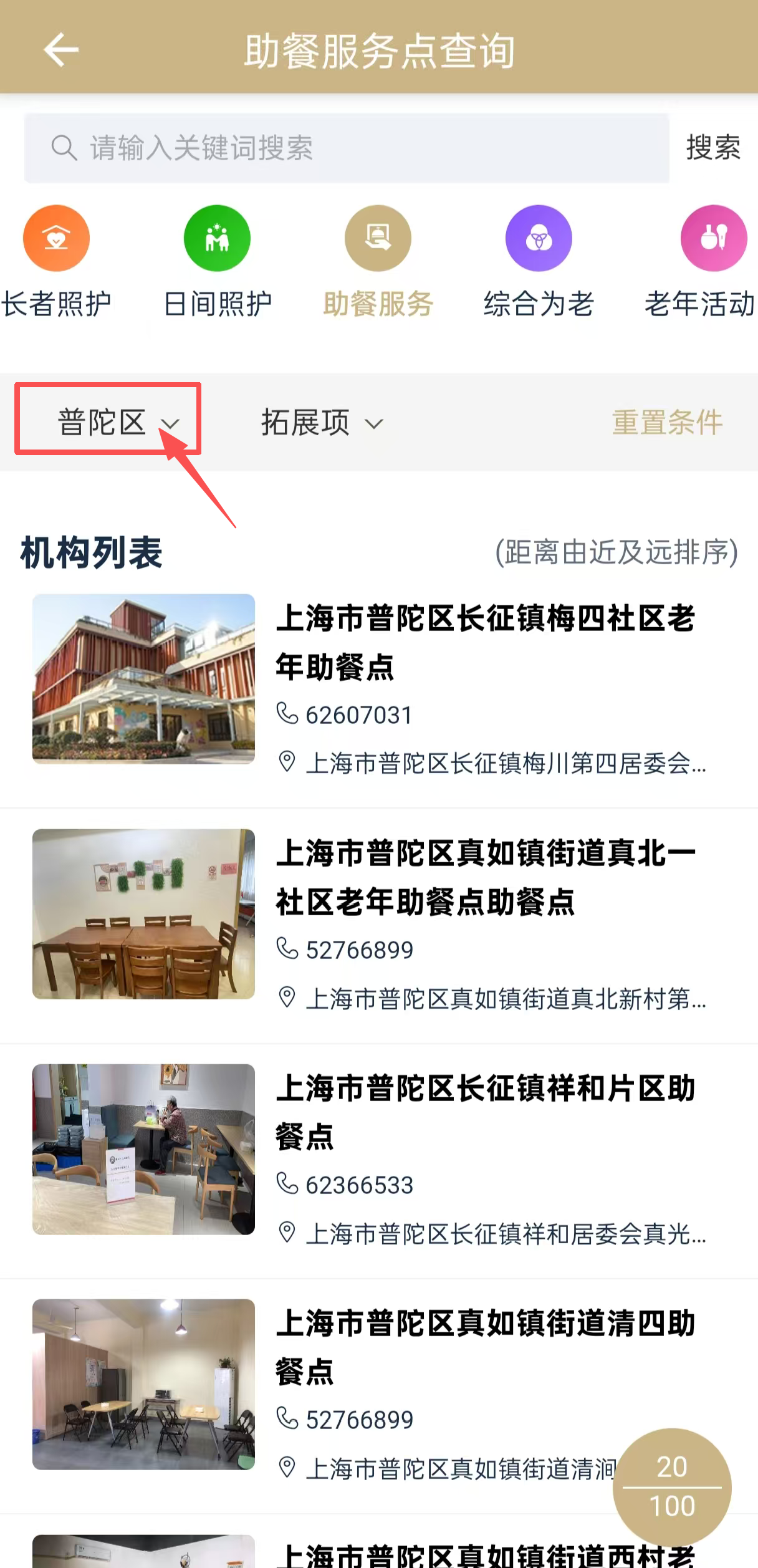 2、打开手机定位,或主动选择所在区域街道等信息,即可查看筛选后的社区食堂、助餐点位置。