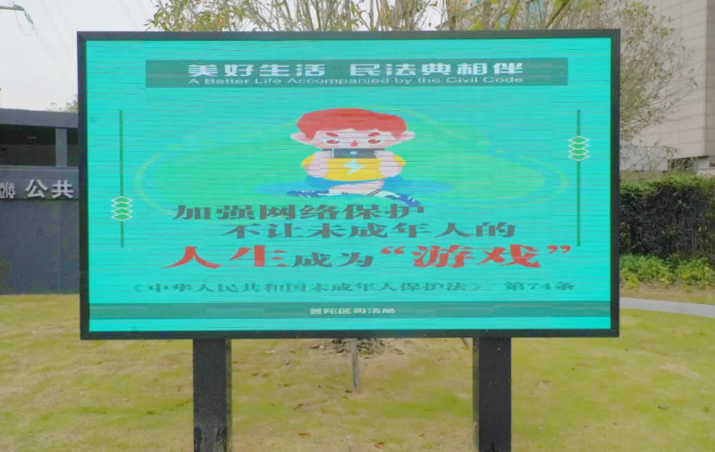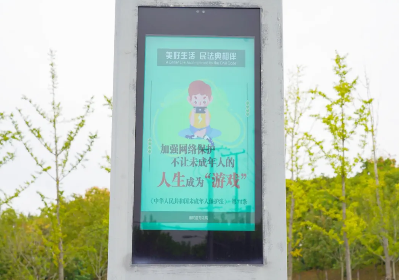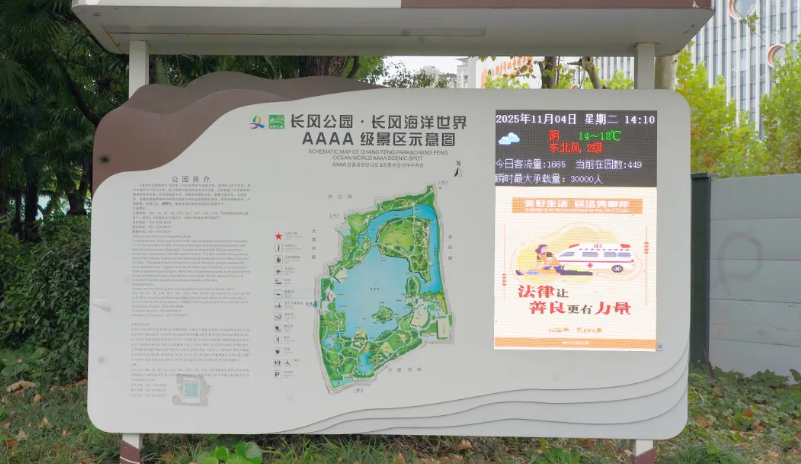 公园里,宪法标识醒目矗立,法治文化亭雅致点缀,法治宣传大屏循环播放着民法典科普动画,让法律知识与法治精神全方位融入游园场景。市民在散步休憩间,既能感受浓厚的法治氛围,又能轻松接受法治熏陶,真正实现“普法接地气、市民易接受”的良好效果。大屏上,法规解读用通俗语言把文明养宠、遗产继承、紧急救助、未成年人保护等“身边事”讲得透彻明白,宪法知识则传递着尊崇法律、维护正义的信念。这些藏在公园里的“法治小课堂”,让法治精神潜移默化住进每个人心里。