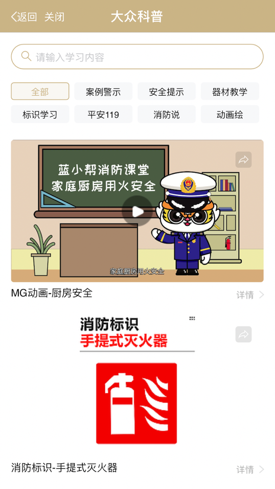 通过还原真实火灾案例视频,直观了解火灾隐患与严重后果;同时掌握隐患自查、应急逃生等实用技能。