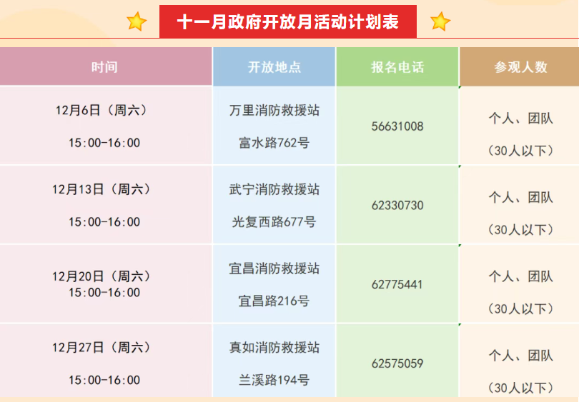 2、预约开放的消防站如有特殊情况,会视情况更换中队或者取消活动,届时会通知。