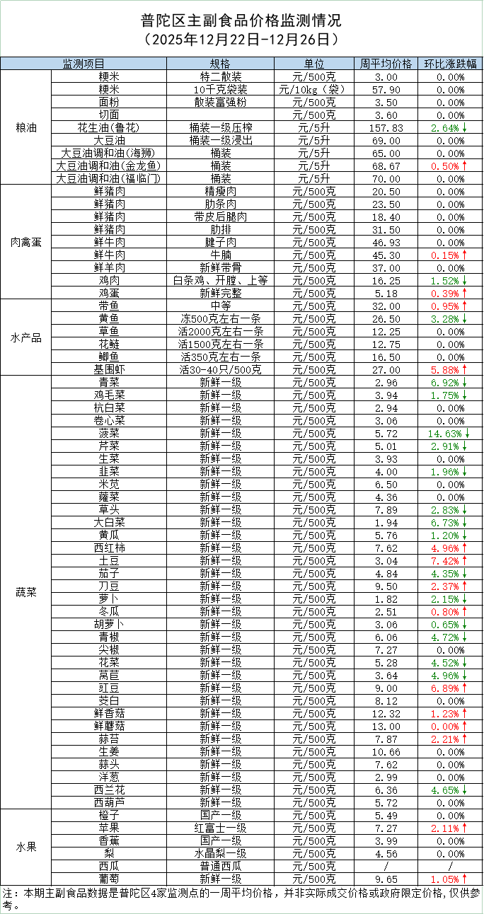 普陀区主副食品价格监测情况 (2025年12月26日)