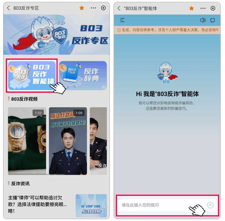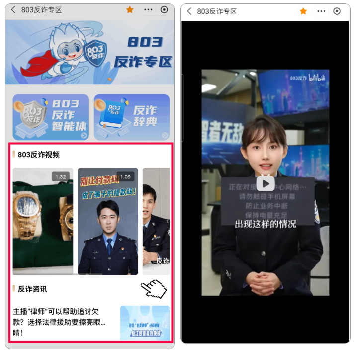 同时智能体还支持实时播报回答,并根据问答内容关联推送“803反诈”视频号内容,帮助大家更直观地理解诈骗手法。
