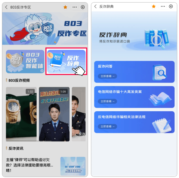 “803反诈专区”整合了反诈问答智能体、反诈资讯和反诈辞典三大核心模块。