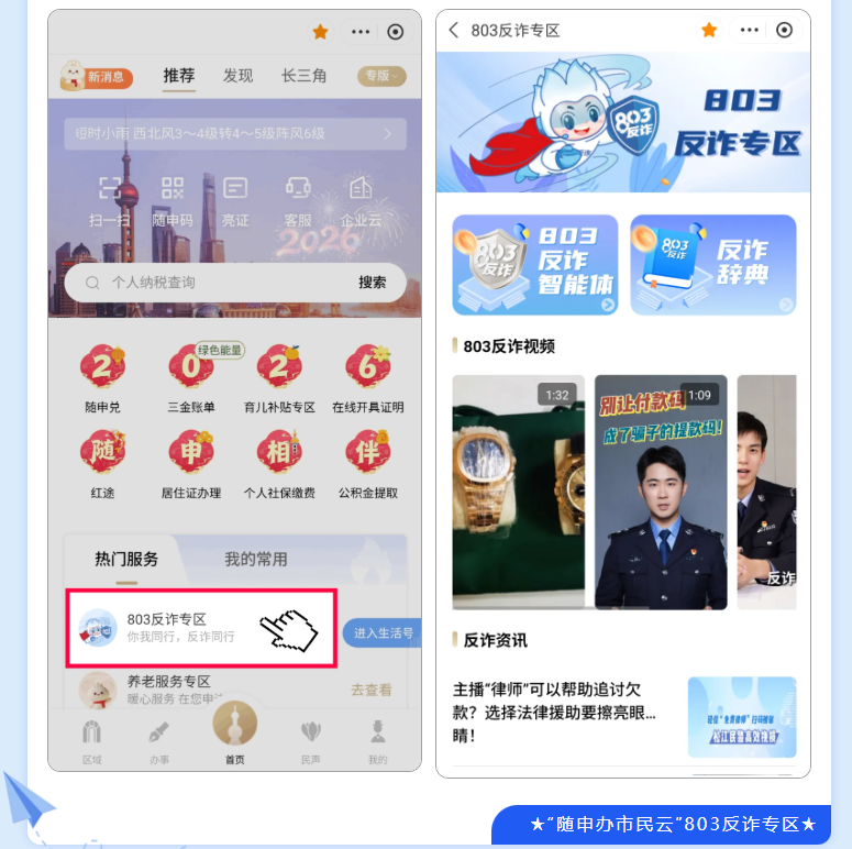 打开“随申办市民云”(APP/微信小程序/支付宝小程序),在首页“热门服务”栏目中找到“803反诈专区”,点击进入即可使用。