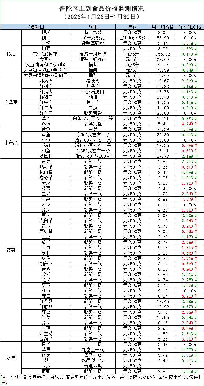 普陀区主副食品价格监测情况 (2026年1月30日)