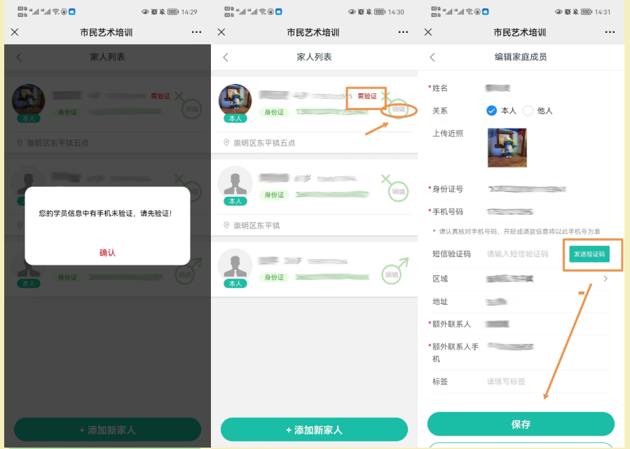 由于本次报名名额有限,并且每个班对年龄有一定的要求,用户需要在报名前实名登记。为了您报名更快捷,请在"我的-家人列表"中提前完善报名人信息并完成手机验证。若未完成验证,进入报名页面时会提示“需验证”。点击“编辑”开始验证,验证成功后点击“保存”即可开始报名。