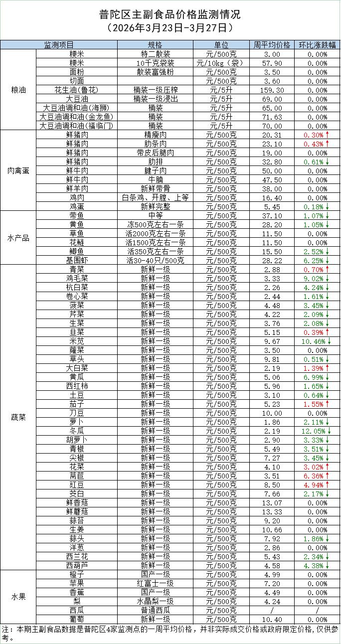 普陀区主副食品价格监测情况 (2026年3月27日)