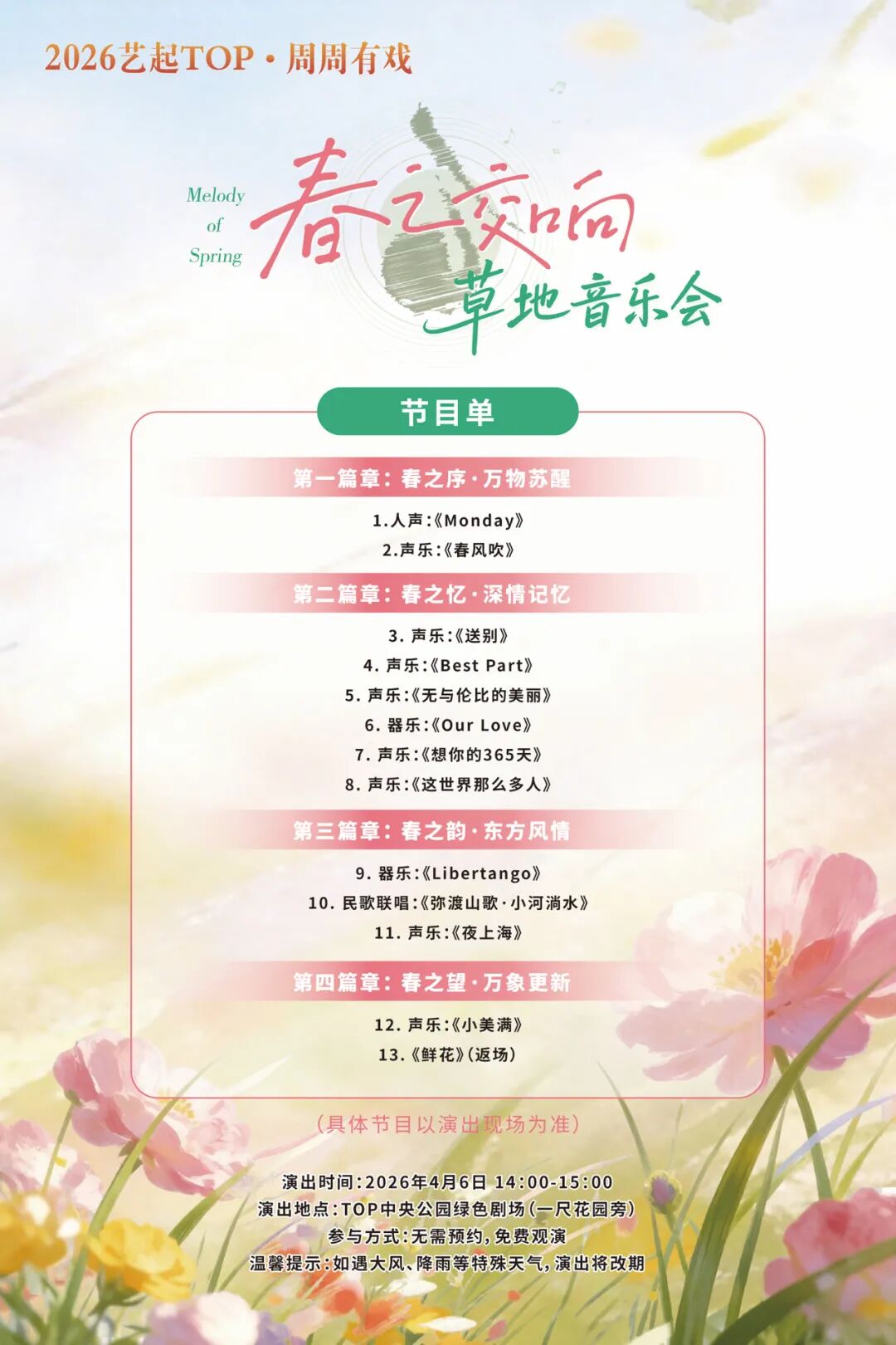 今年,“艺起TOP·周周有戏”系列活动将全面升级、贯穿全年,以每周不断的节奏持续输出,设置春、夏、秋、冬四大主题板块,实现四季轮转、活动不断档。春季延续去年,以“春之交响”草地音乐会为核心,截至4月底将连续举办7场演出;夏、秋、冬三季将进一步拓展活动形式,围绕阅读、非遗、演艺等多元内容持续发力,以高质量、常态化的文旅供给,为市民解锁“家门口的诗与远方”,也为城市文商旅融合发展注入源源不断的活力。