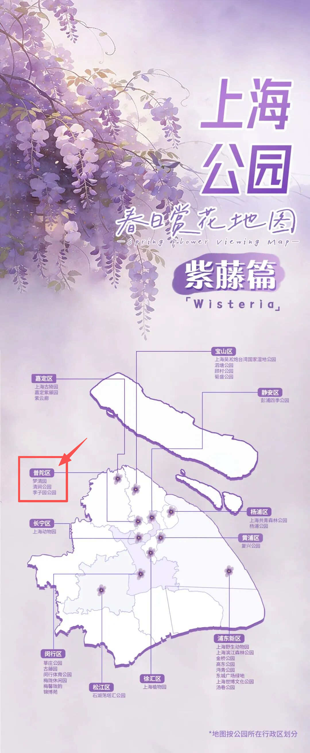 风过处,花影婆娑,暗香浮动。一帘幽紫,半枕清风,花穗如流苏轻扬,似揉碎了漫天云霞。沪上多处公园皆有紫藤缀春,这份紫藤盛开地图请收好,快来赴一场浪漫之约~