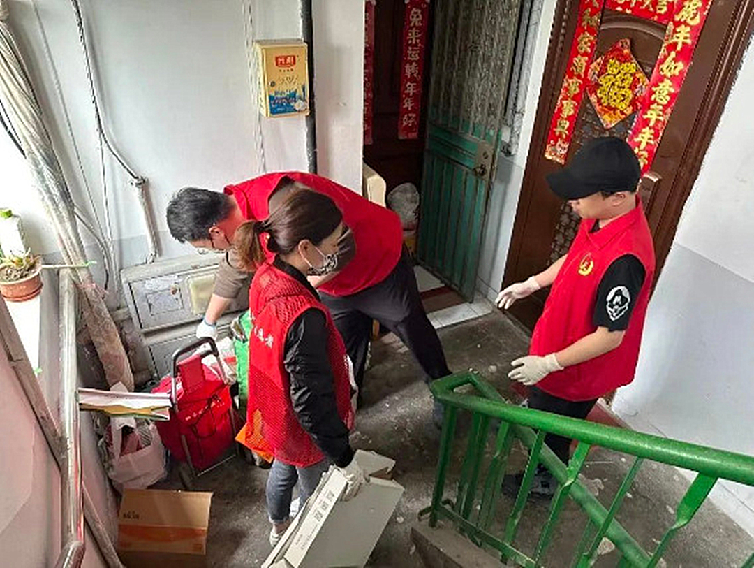 在居民区,居委干部和志愿者们穿梭在小区的各个角落,开展美丽家园清洁活动,对公共区域以及楼道进行清扫。大家手持扫帚、垃圾袋、抹布等工具,以环境卫生、垃圾清运、楼道堆物、僵尸车、黑广告等社区顽疾为整治重点,积极开展清理行动。