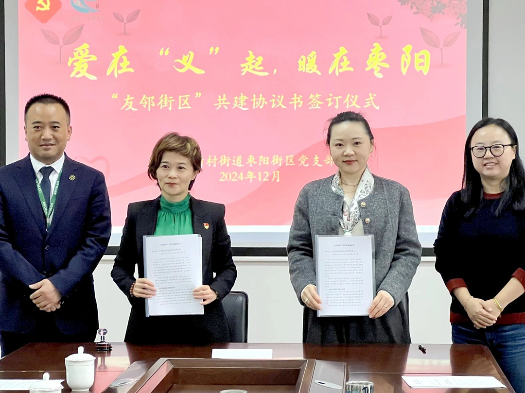 近日,枣阳街区党支部与链家房地产经纪有限公司第三党支部进行了“友邻街区”街社共建协议签约仪式。