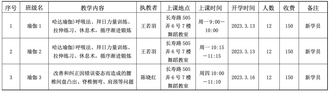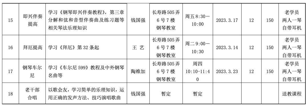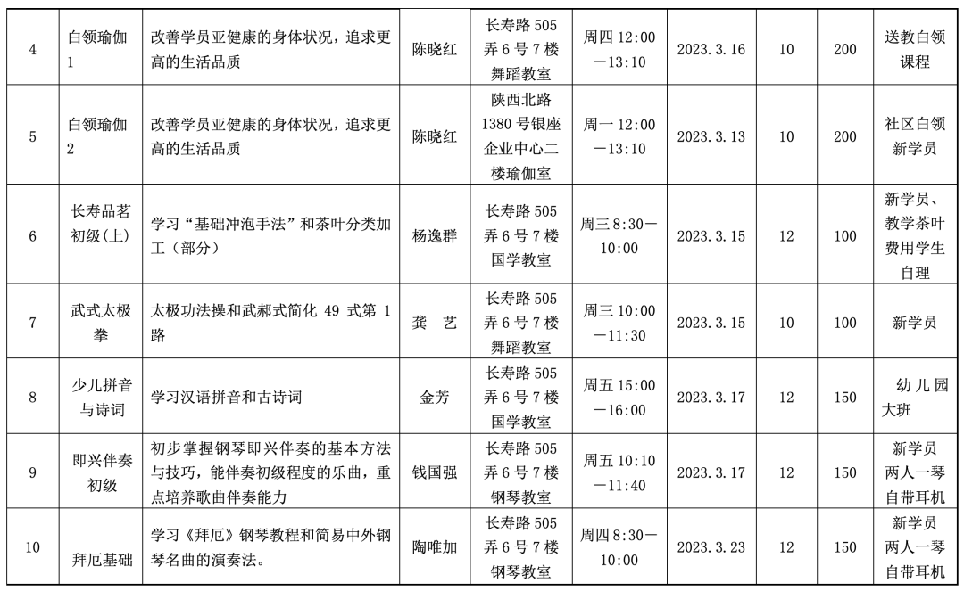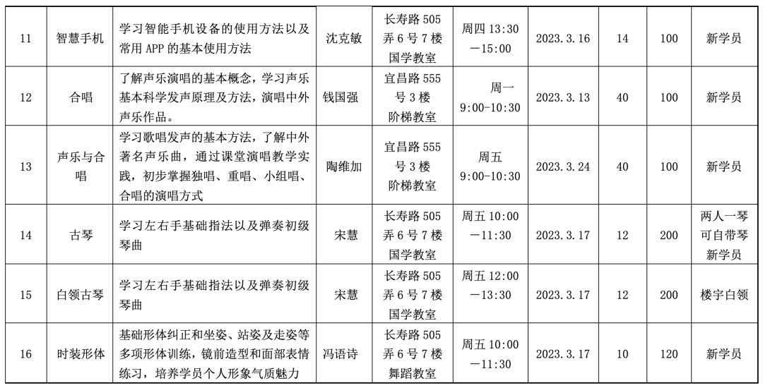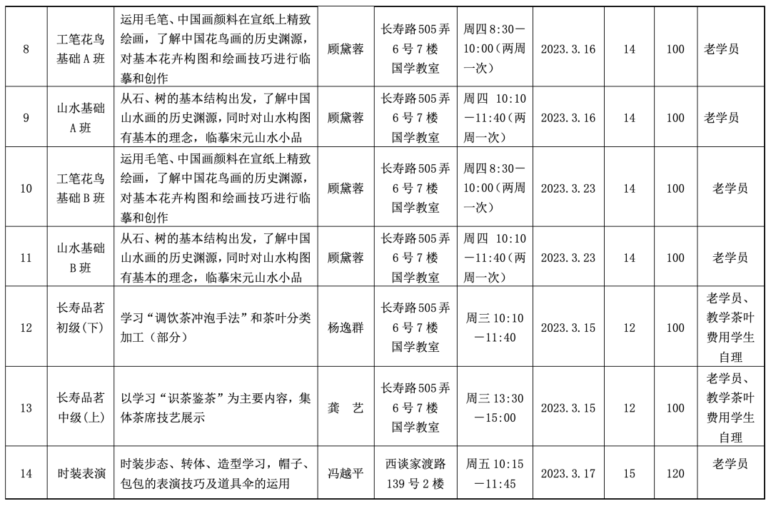 上课时间:2023年3月13日至6月底,每周一节(1.5小时),共计14周(个别课程7周),招生简章替代上课通知,请按照所列时间、地点上课。