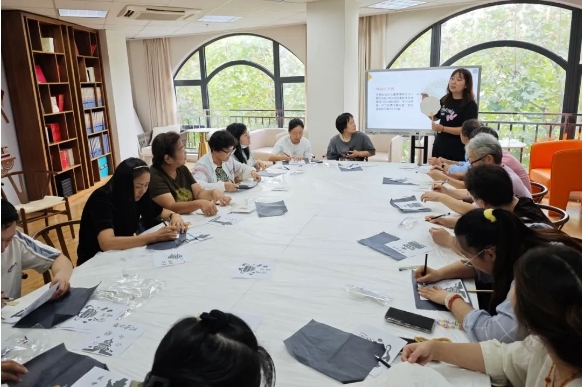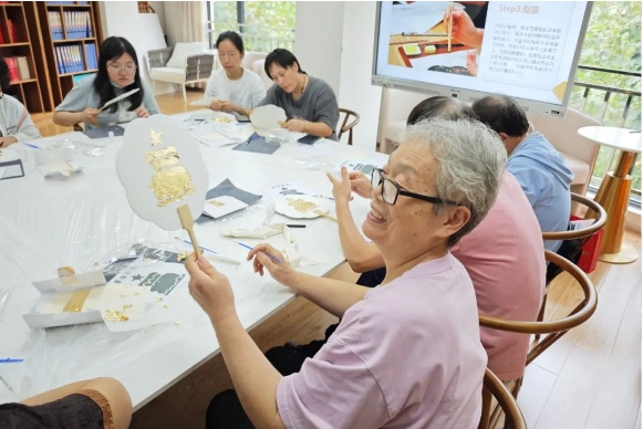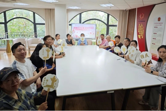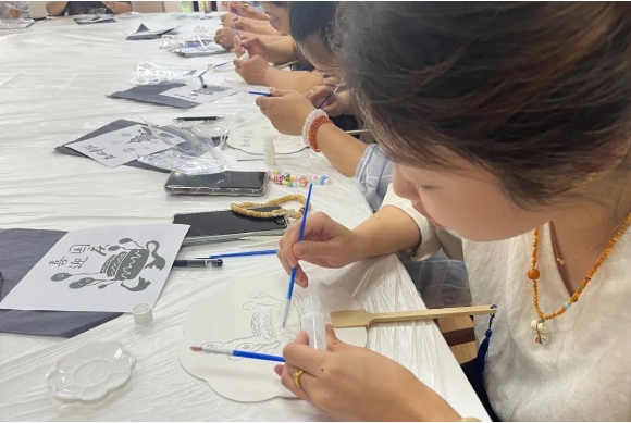 在工作人员的耐心指导和示范下,大家纷纷拿起画笔,投入到团扇的制作中,按照绘制、涂胶、贴箔、清理等步骤,一丝不苟地完成每一个环节,将自己对祖国的深情厚谊融入到团扇制作中。