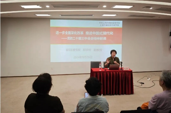 此次讲座特邀普陀区委党校教研室主任、副教授郝云玲以《进一步全面深化改革推进中国式现代化——党的二十届三中全会精神解读》为题作专题授课。