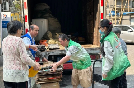 活动现场,社区居民热情高涨,纷纷携带衣物、塑料瓶、旧书籍、纸箱等可回收物,前往指定地点进行称重结算。