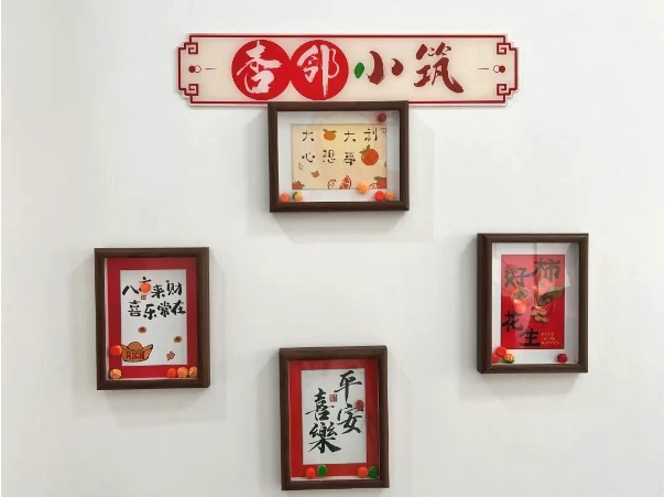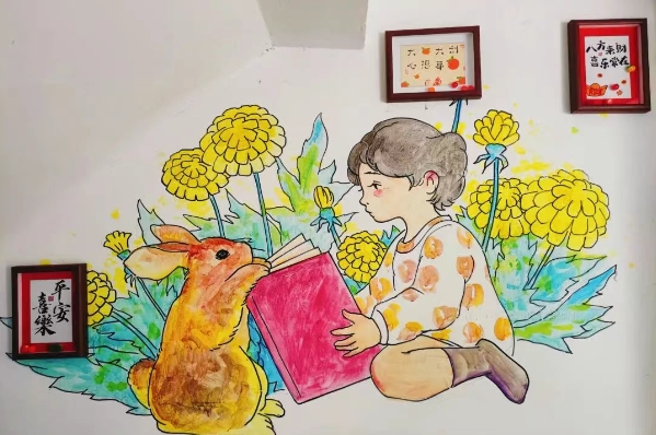 壁画完工后,志愿者团队便接力登场,开展装饰工作,将精心准备的“杏邻小筑”“杏染芳庭”等楼栋雅称标语牌有序安装在墙面。印有 “大吉大利”“平安喜乐” 的木质相框错落悬挂,与壁画相互映衬,让原本朴素的楼道变得更加精致典雅。