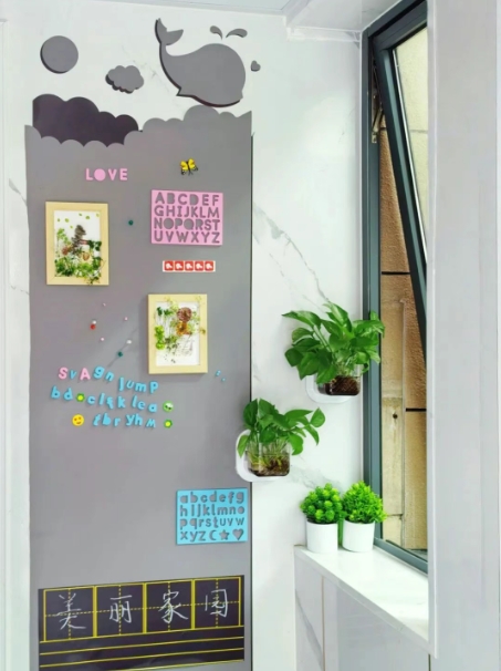 曹杨五村196号在“微改造”的基础上,创新采用“磁吸+绘画”的形式,打造“童趣妙笔绘家园”主题楼道。儿童通过绘画装饰公共空间,既美化环境又激发社区参与感,磁吸设计兼顾美观与实用性,让创意与温情在楼道中流动,为社区治理注入鲜活童趣。