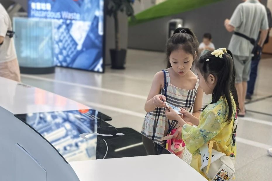 最让孩子们兴奋的是手中的垃圾分类打卡卡片,仿佛拿到“寻宝图”的小探险家们立刻行动起来。“这个问题我会!”“快来看,这里有打卡点!”孩子们拿着卡片激动地在各个展台前穿梭答题,小小的身影里满是活力与热情。社区科普工作人员在一旁细心提醒孩子们注意安全,并辅助孩子们一起解锁打卡任务。除了答题打卡的乐趣,大家也通过多媒体展示、实物模型和互动装置,深入了解了生活垃圾从产生、分类到处理的全过程,以及垃圾焚烧发电、生物降解等创新技术,深刻感受到科技在垃圾处理中的巨大作用。
