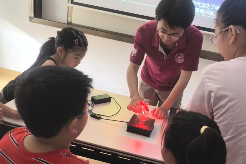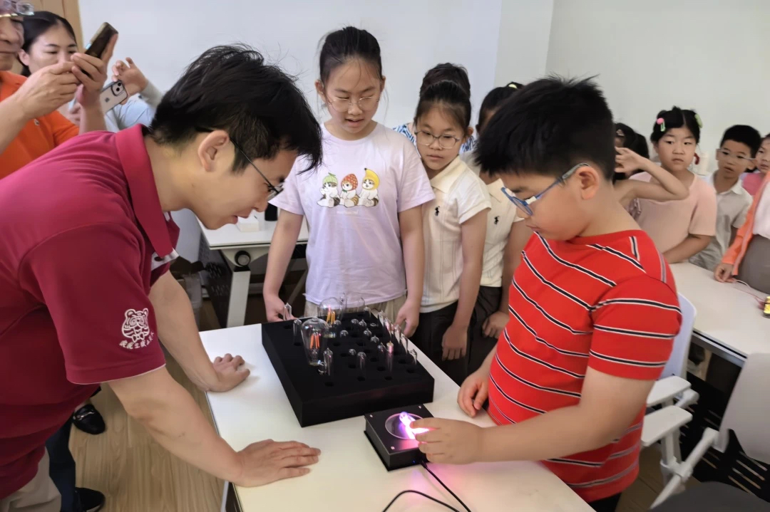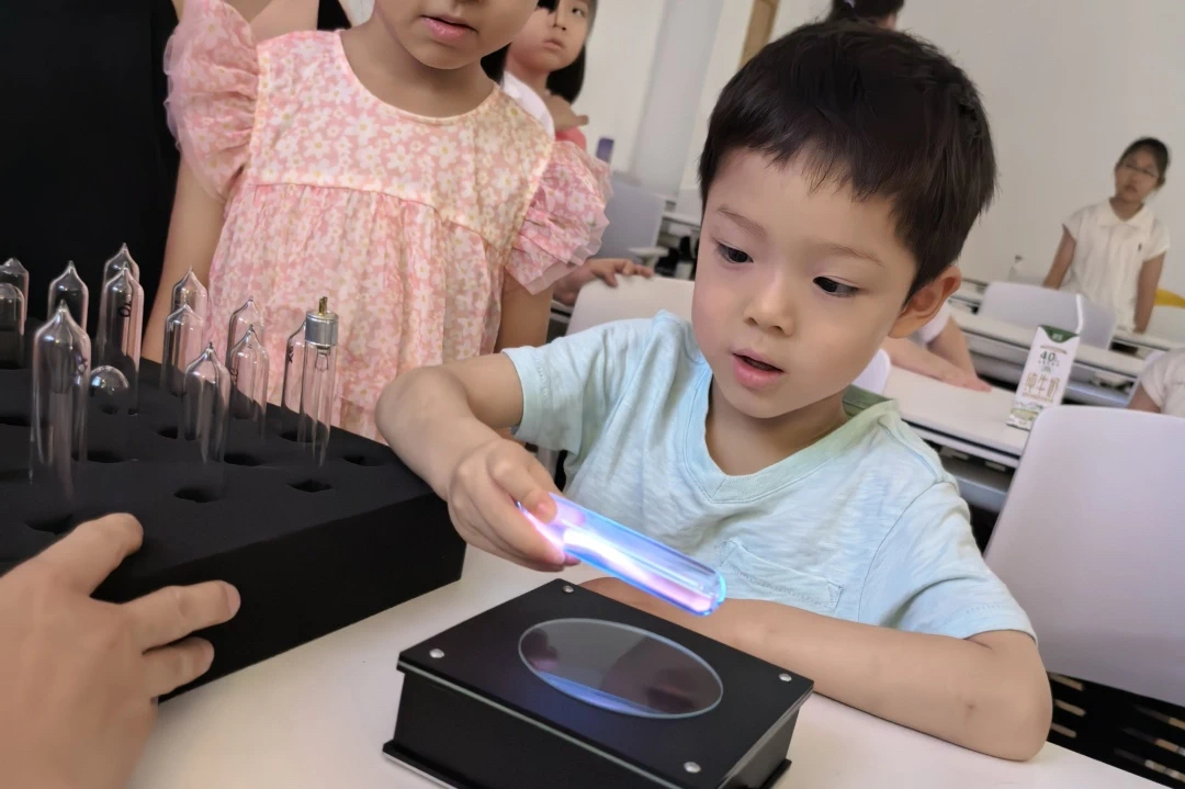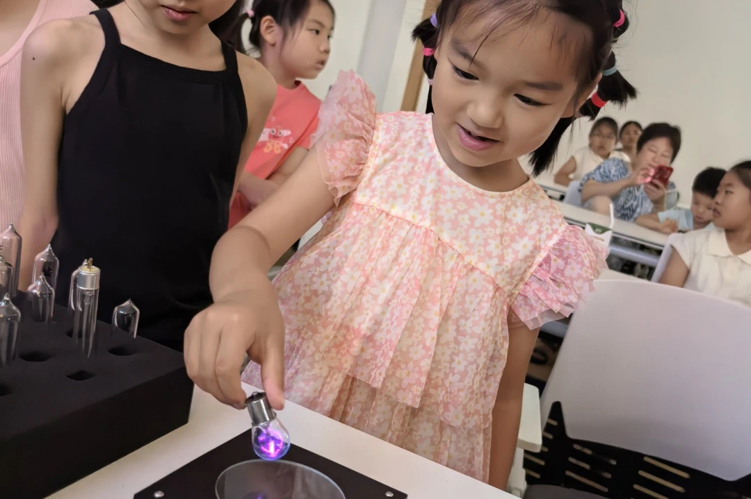 此外,梁老师还结合一个带着透明玻璃罩的装置,为孩子们展示了气体的“另一面”。只见玻璃罩底座上的加热板微微发红,梁老师用夹子夹起几个装着不同气体的小玻璃管,依次固定在加热板上方。随着加热板温度慢慢升高,神奇的一幕出现了——第一个玻璃管里的气体开始“苏醒”,灯泡亮起时,淡紫色的光像裹着一层薄雾,在玻璃壁上轻轻晃动,像极了傍晚天边的晚霞;换了另一种气体,灯光突然变成了鲜亮的橙红色,像小太阳掉进了玻璃罩;轮到第三个,幽蓝的光忽然漫出来,像把深海的星光装进了管子里,安静又神秘。