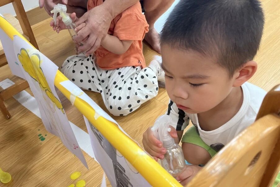 进入实践环节后,孩子们先用蜡笔为云朵涂色,再由老师将画纸悬挂起来。随后,孩子们手持喷壶,朝着云朵轻轻喷洒,蜡笔的色彩顺着画纸垂流而下,生动模拟出下雨的场景。