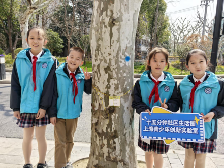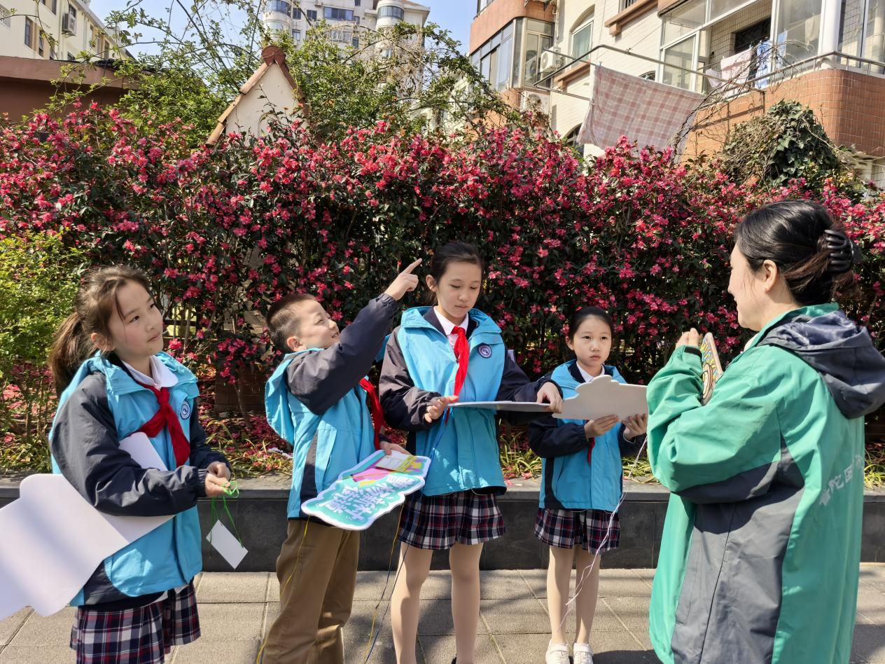 少先队员们在曹杨二中附属学校门口集合,在区绿容局专业老师的带领下,开启了一场特别的“社区探绿”CityWalk。