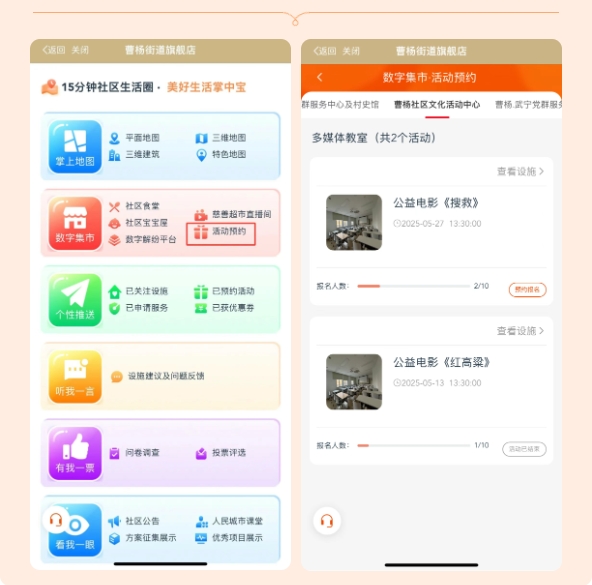 在“吃”方面享受到了优惠,那么在“玩”方面,又有哪些好去处呢?在应用程序中可以看到,“掌中宝”曹杨场景分为掌上地图、数字集市、个性推送、听我一言、有我一票、看我一眼六大板块,其中,点击进入 数字集市 板块中的 “活动预约” 部分,即可跳转至社区各项活动的详情页,居民朋友们可结合实际情况进行预约。