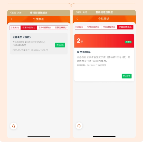 预约成功后,还可以在 个性推送 板块的 “已预约活动” 中进行查看。(ps:领取到的社区食堂优惠券也能在此处查看哦~)