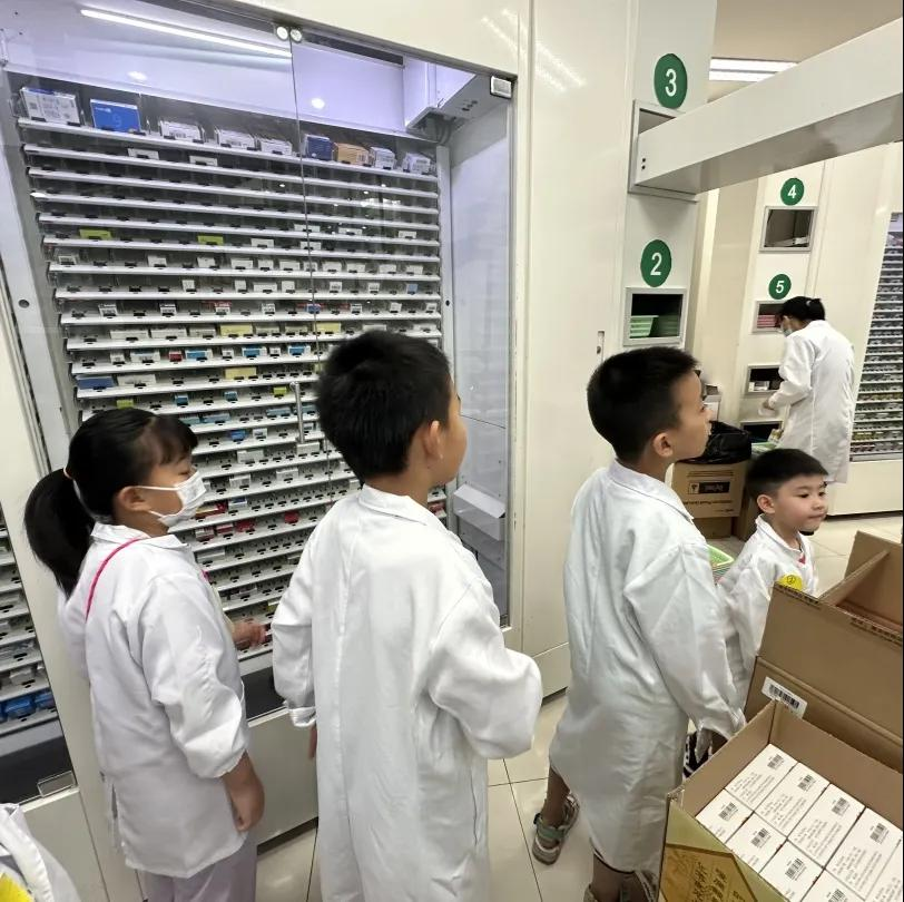 活动伊始,小朋友们积极上台进行自我介绍,认识身边的小伙伴。随后,各位小医生在药师的带领下开启了第一站:体验门诊药房。面对一台台自动发药机、货架上一排排药品,小朋友们发出了疑问:“自动发药机是怎么样工作的呢?”在了解孩子们的困惑之后,药师带着他们认识自动发药机系统,了解从医生开好医嘱,到药品处方打印,再到药师审方调配发放药品的一系列流程。小学员们还认真学习了药品的多种剂型和应用特点,识别药品有效期的方式,这一环节让他们更好地了解到药师的工作内容。