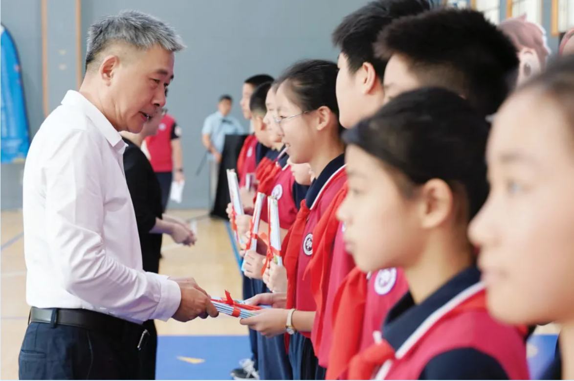 镇党委书记王春明来到梅陇中学参加开学典礼,为新生代表赠送校园安全管理手册,助力学生尽快适应新环境、健康快乐成长。