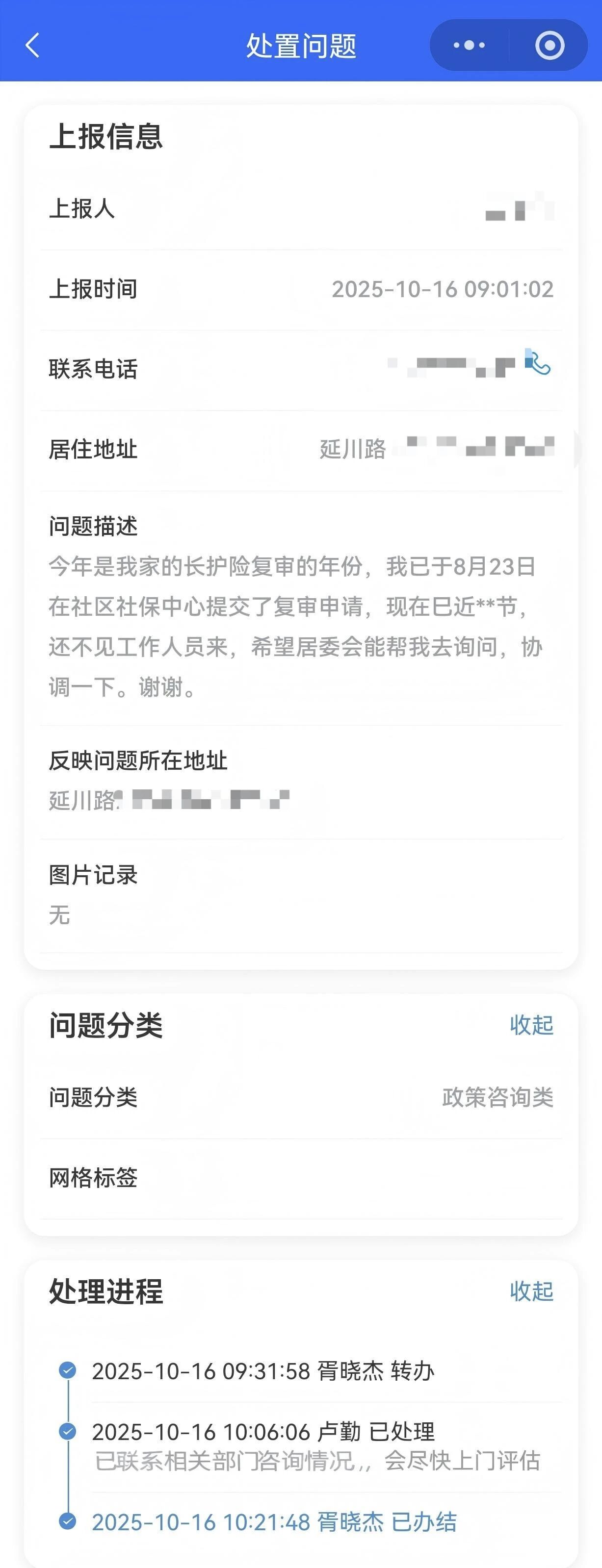 经过沟通协调,发现原来是居民误将长护险工作人员的来电作为陌生电话拒接,工作人员多次联系居民未果,导致流程停滞。居委会的主动介入,成功打破了因信息不畅形成的“僵局”。最终,在居委会的协调下,居民长护险工作人员与居民重新约定了上门复评时间,困扰居民多日的“焦急事”得到了圆满解决。