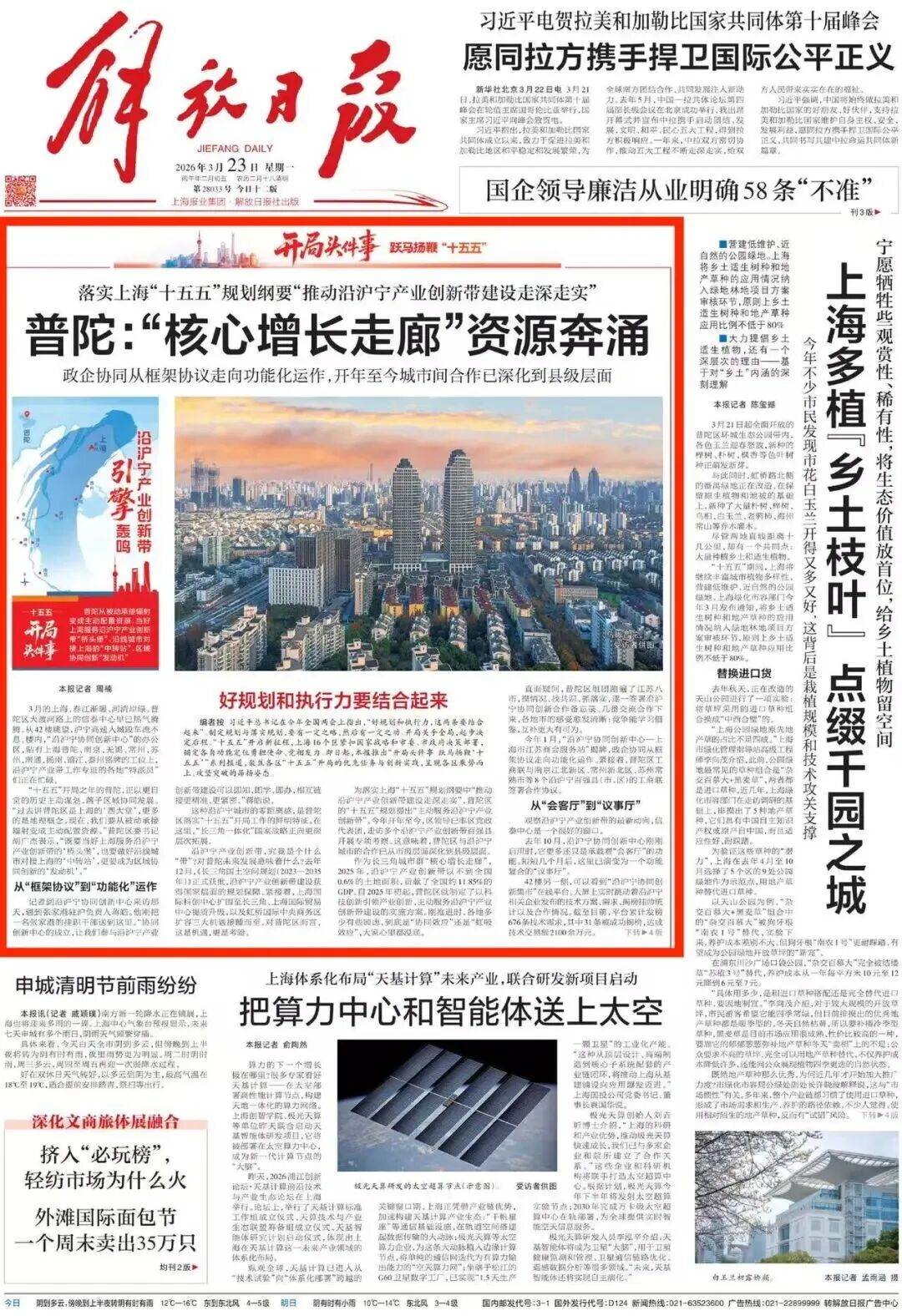《解放日报》头版头条报道:落实上海“十五五”规划纲要,普陀推动沿沪宁产业创新带建设走深走实 2026年03月24日 来源: 长征镇