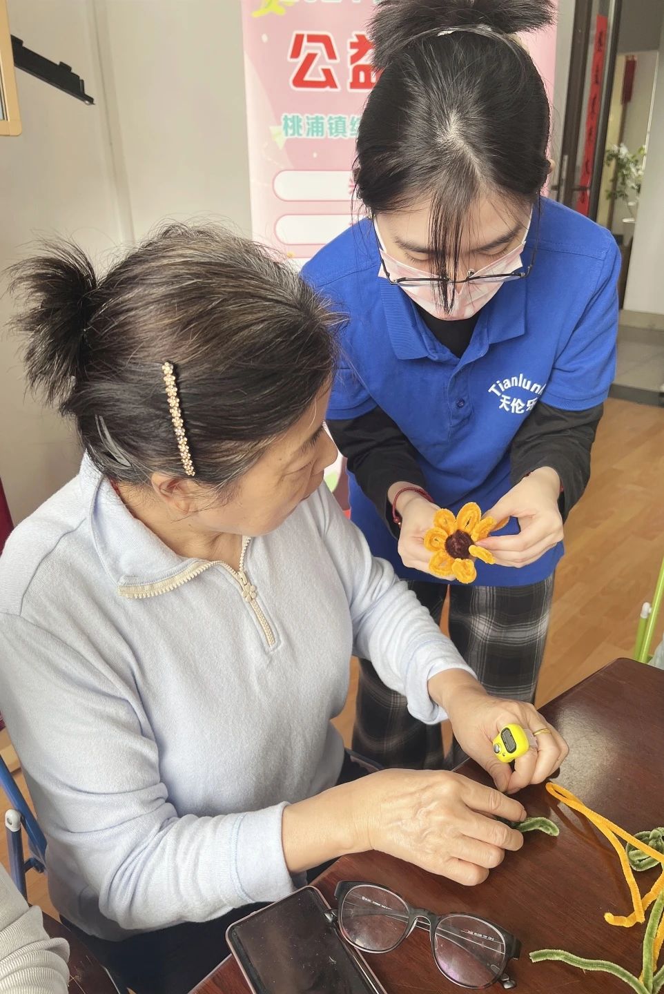活动当日,精神矍铄的老人们齐聚一堂。在老师引领下,他们纷纷戴上老花镜,手握五彩斑斓的扭扭棒,踏上了充满创意的制作之旅。老人们的手指在扭扭棒间灵活跳跃,时而轻柔扭转,时而紧紧缠绕,全神贯注地投入到创作中。最终,一朵朵形态万千、绚丽多彩的向日葵在他们的巧手下绽放,这些作品不仅彰显了老人们的智慧与匠心,更寄托了他们对生活的无限热爱与美好憧憬。